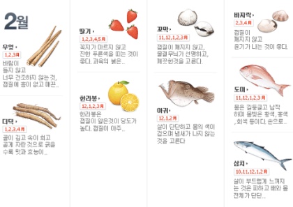 제철음식이나 과일도 익는 과정에서 스트레스를 받기 마련인데, 제철일 때는 그 스트레스에 대응하기 위해 자체적으로 생식력, 면역력, 순환력을 높이기 때문입니다. 2월에는 1월과 중복되는 식재료가 많은데 , 제외하고 알아보도록 하겠습니다.