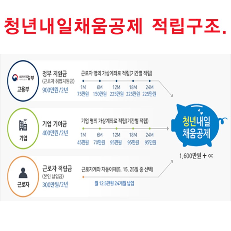 청년 내 일체움공제는 청년가입자가 2년간 400만 원(16만 원/20개월 + 2만 원/4개월)을 납입하면 기업과 정부가 각각 400만 원을 정립해 2년 만기 후에 1200만 원을 돌려주는 제도입니다.